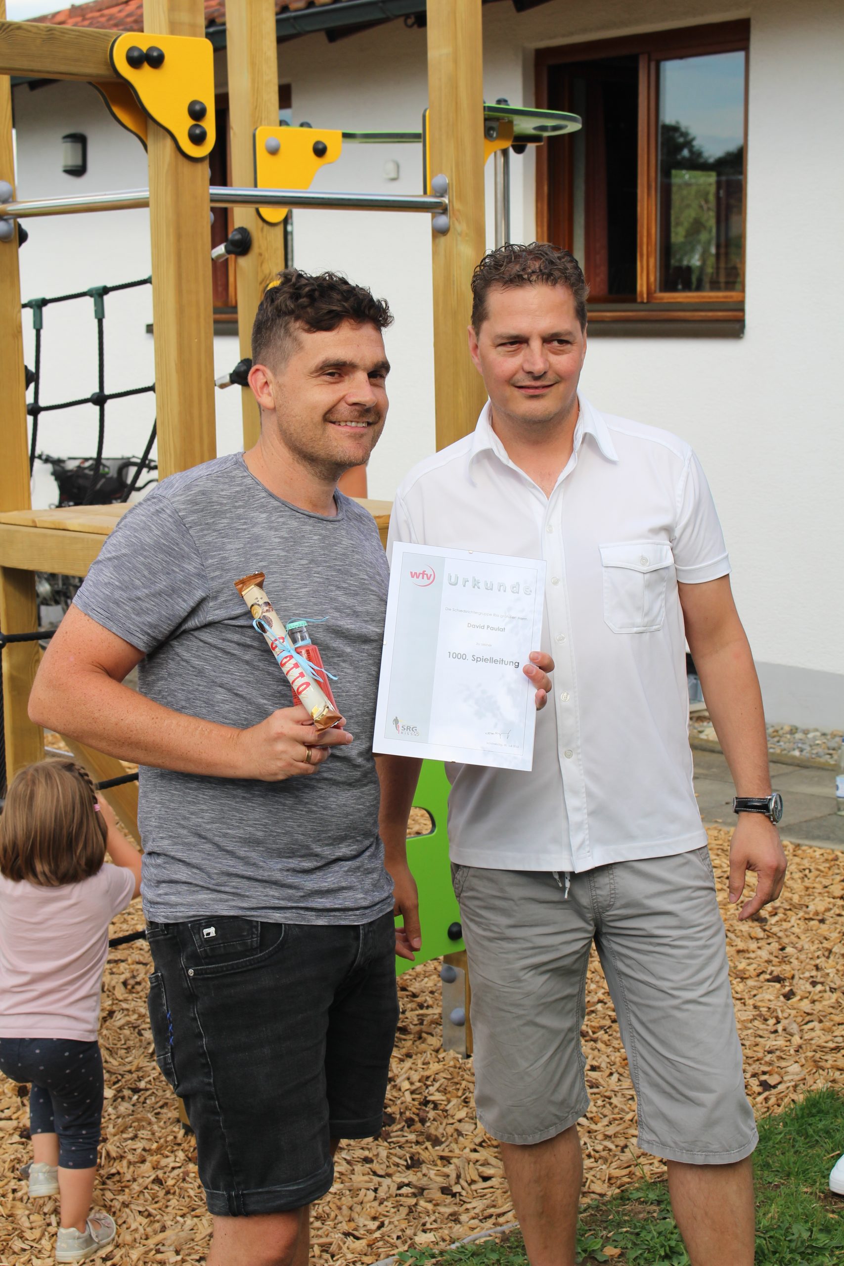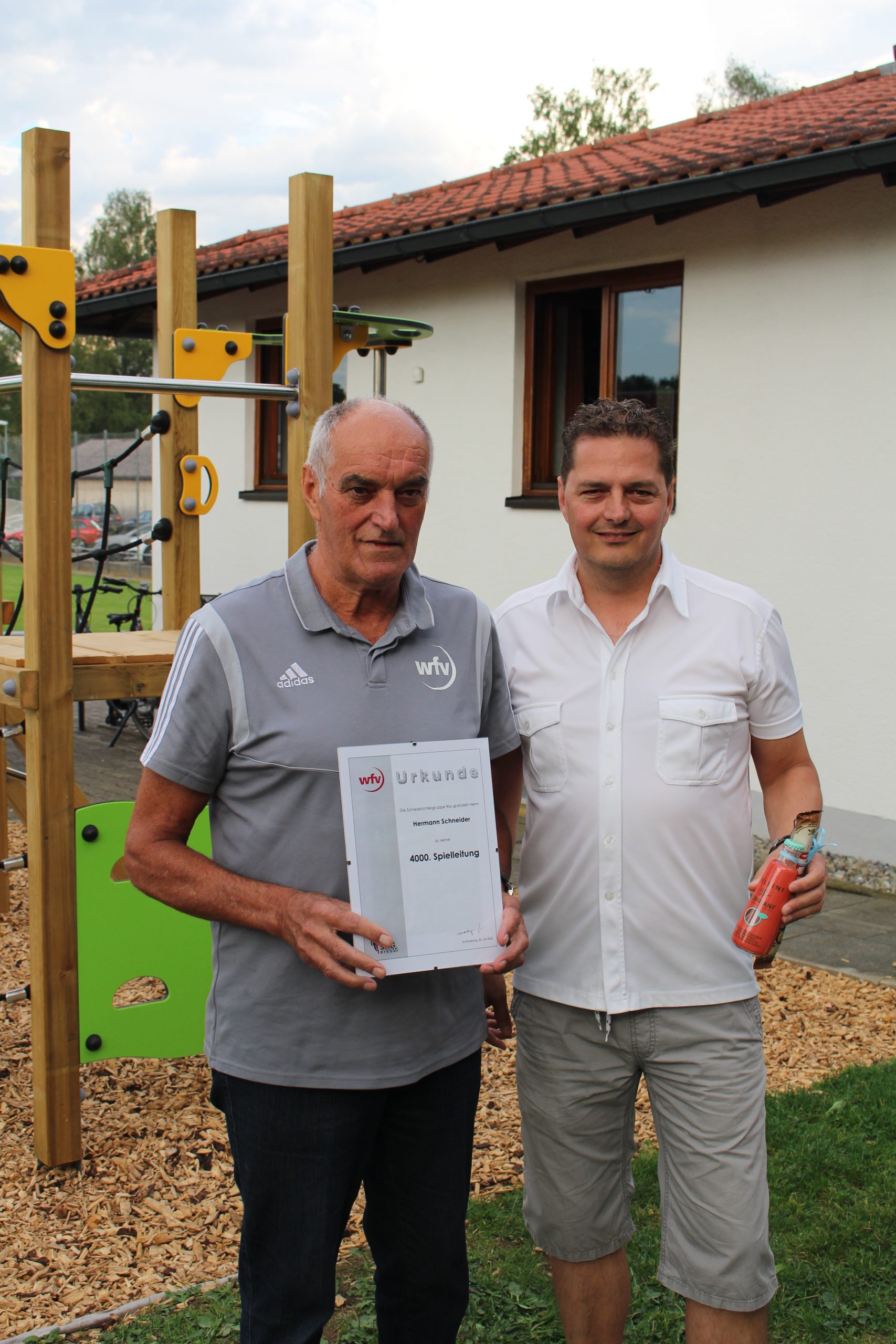 Eine ganz besondere Ehrung erhielt darüber hinaus Hermann Schneider, bereits als Ehrenmitglied ernannt, von den SF Schwendi. Er erhielt von Jochen eine Urkunde über seine 4000. Spielleitung. Eine schier unfassbare Anzahl an Spielen, die so im gesamten wfv Gebiet vermutlich ihresgleichen sucht. Im selben Zug wurde Erich Lämmle vom SV Ringschnait, ebenfalls ein Ehrenmitglied, für sein 2500. Spiel geehrt.
