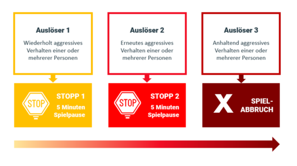 Bei wiederholt aggressivem Verhalten einer oder mehrerer Personen auf dem Sportgelände kann der Schiedsrichter die erste STOPP-Spielpause einsetzen, um die Gemüter zu beruhigen. Legen dieselben oder auch andere Personen nach Wiederaufnahme des Spiels erneut aggressives Verhalten an den Tag, kann der Schiedsrichter entscheiden, eine zweite Spielpause und zeitgleich „letzte Warnung“ auszurufen. Sollten sich die Gemüter nach wie vor nicht beruhigen und es kommt zu anhaltend aggressivem Verhalten, bricht der Schiedsrichter die Partie ab.