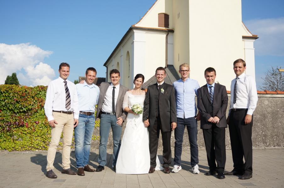 Bei strahlendem Sonnenschein ließ es sich auch eine Delegation der SRG Riss nicht nehmen, bei diesem besonderen Ereignis in der Oberopfinger St.-Vincentius-Kirche dabei zu sein. In gewohnter Weise wurde im Anschluss an die Trauung ein „Fahnen- Spalier“ gebildet (Danke Pablo und Andy an dieser Stelle!), durch welches das Brautpaar die Kirche verließ.