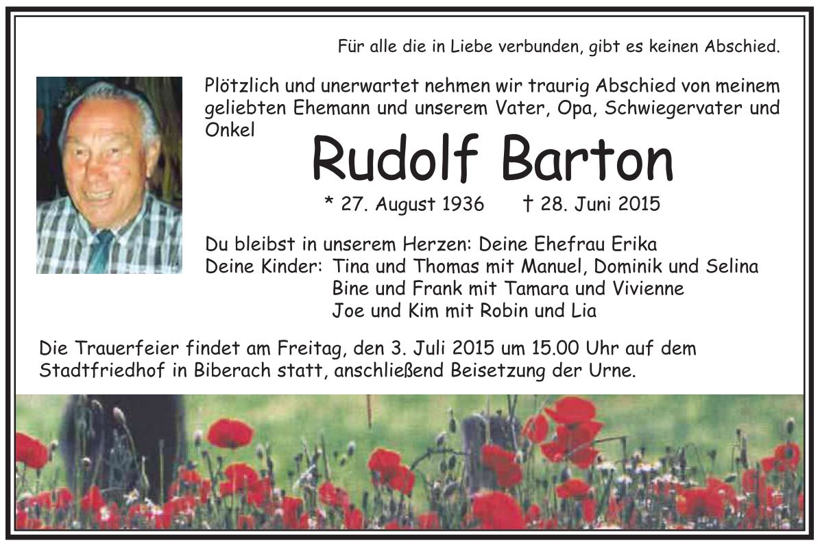 Die Trauerfeier mit Urnenbestattung findet am kommenden Freitag, den 03.07.2015, um 15.00 Uhr auf dem Stadtfriedhof Biberach statt.